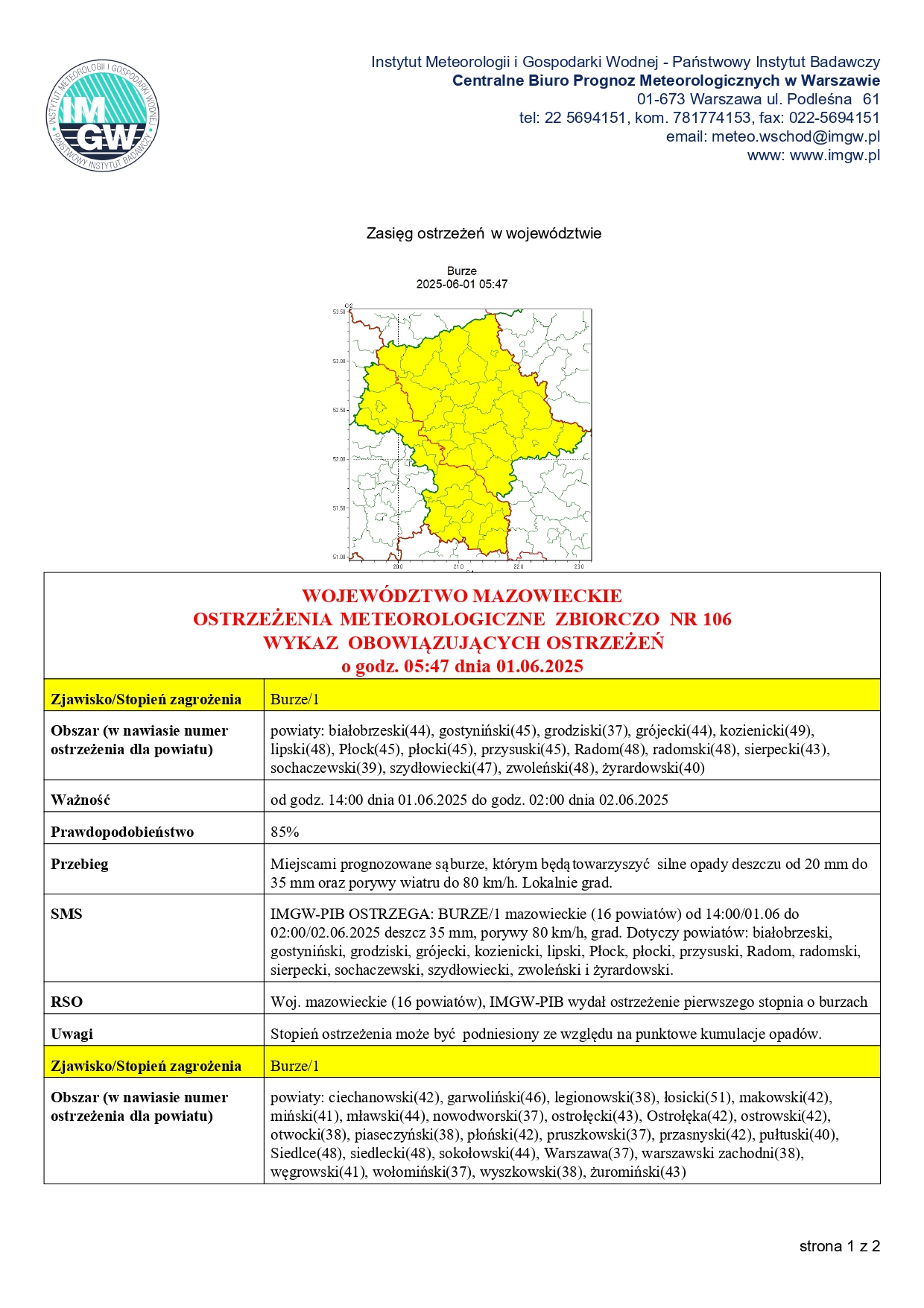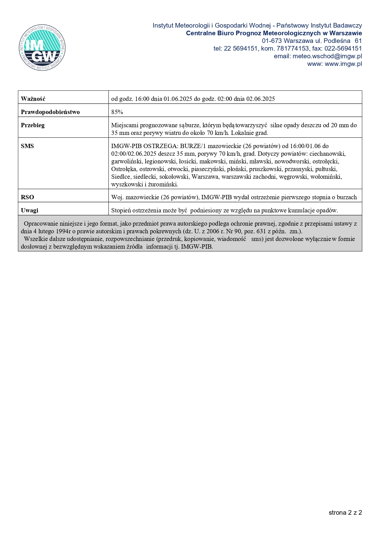 Miejscami prognozowane są burze, którym będą towarzyszyć silne opady deszczu od 20 mm do 35 mm oraz porywy wiatru do 80 km/h. Lokalnie grad.