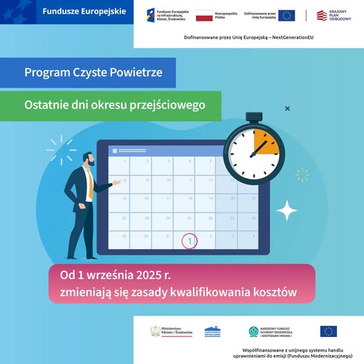 Przypominamy, że do 31 sierpnia 2025 r. trwa okres przejściowy w programie Czyste Powietrze. To ostatnia szansa, by złożyć wniosek o dofinansowanie na inwestycje rozpoczęte po 28 maja 2024 r., które nie zostały zgłoszone przed zawieszeniem programu w listopadzie ubiegłego roku.
