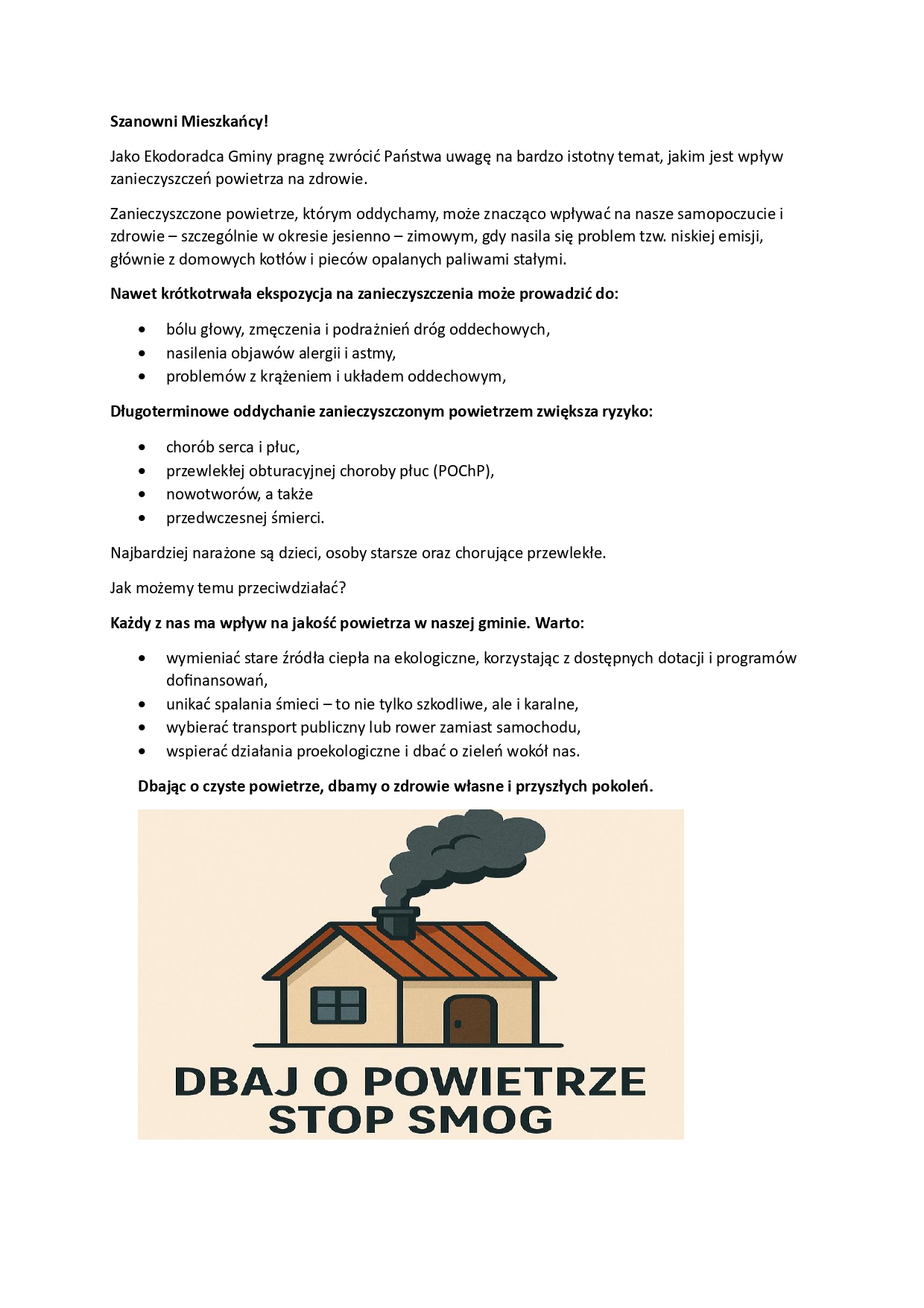 Zanieczyszczone powietrze, którym oddychamy, może znacząco wpływać na nasze samopoczucie i zdrowie – szczególnie w okresie jesienno – zimowym, gdy nasila się problem tzw. niskiej emisji, głównie z domowych kotłów i pieców opalanych paliwami stałymi.