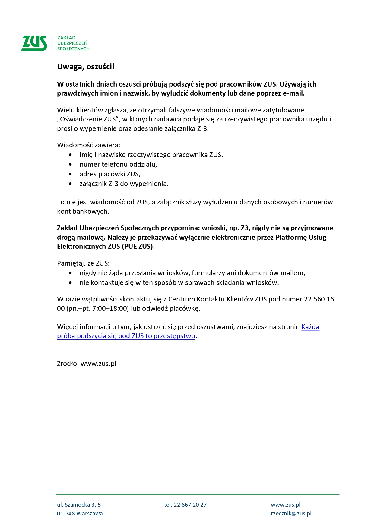 Więcej informacji dostępnych na stronie: https://www.zus.pl/-/ka%C5%BCda-pr%C3%B3ba-podszycia-si%C4%99-pod-zus-to-przest%C4%99pstwo