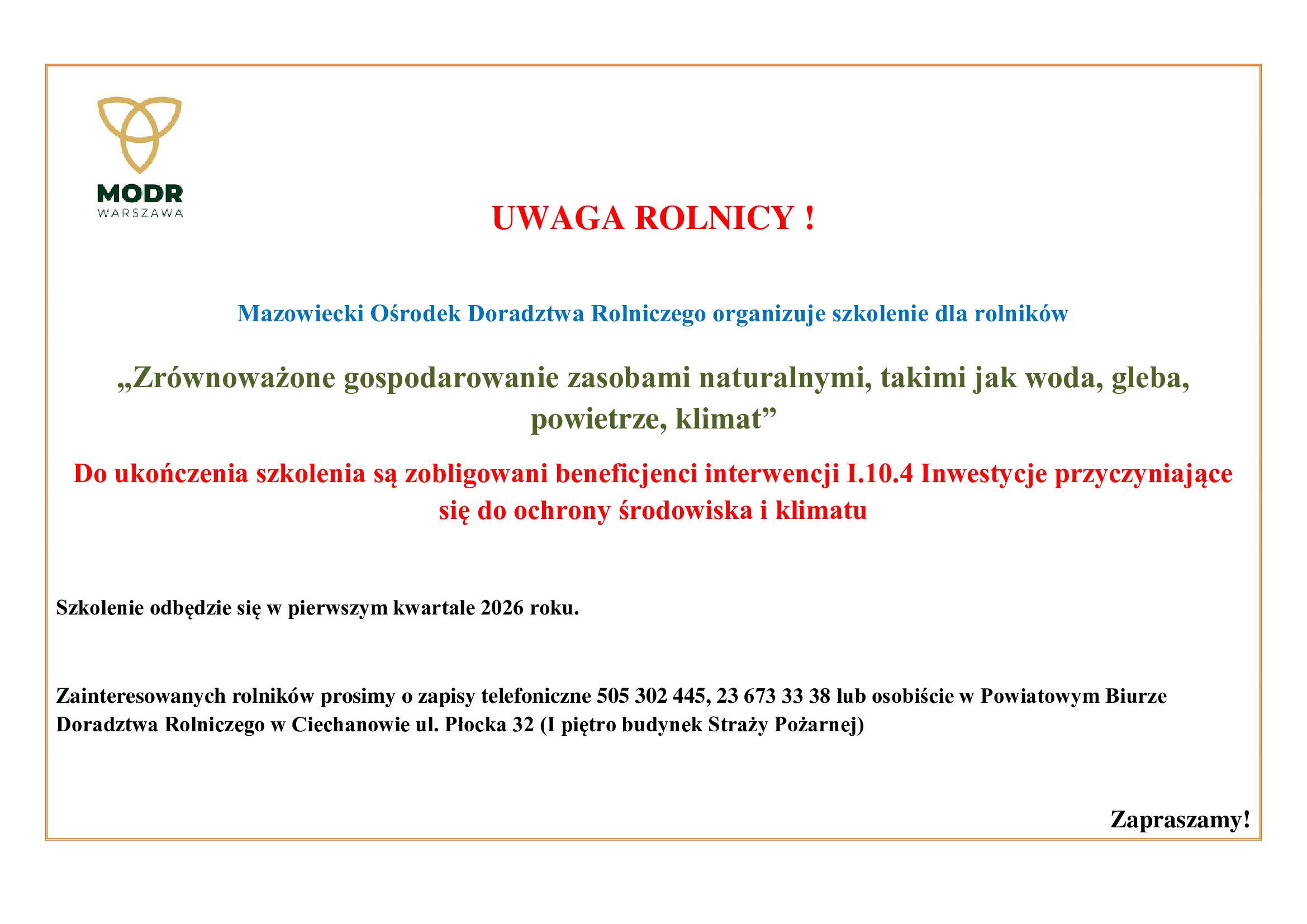 Mazowiecki Ośrodek Doradztwa Rolniczego organizuje szkolenie dla rolników. „Zrównoważone gospodarowanie zasobami naturalnymi, takimi jak woda, gleba, powietrze, klimat”
