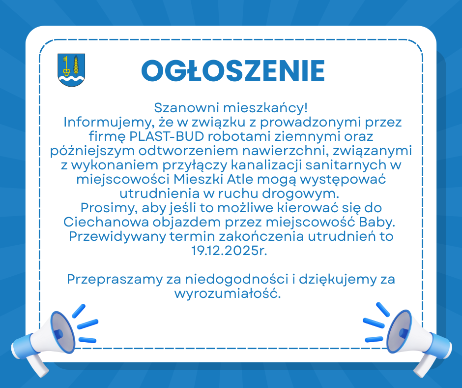 Informujemy, że w związku z prowadzonymi przez firmę PLAST-BUD robotami ziemnymi oraz późniejszym odtworzeniem nawierzchni w miejscowości Mieszki Atle mogą występować utrudnienia w ruchu drogowym.