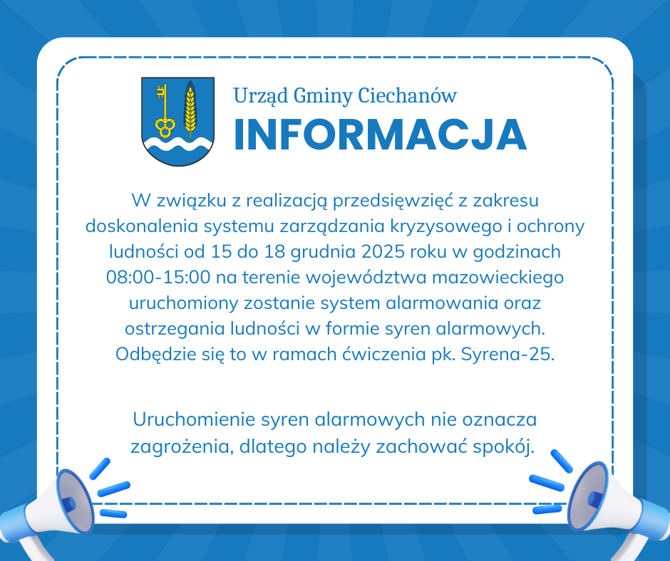 W trakcie ćwiczenia emitowane będą sygnały akustyczne tj. ciągły dźwięk syren alarmowych trwający 1 minutę na ogłoszenie i odwołanie alarmu. Sygnały będą miały charakter ćwiczebny i służyć będą wyłącznie sprawdzeniu funkcjonowania systemu alarmowania