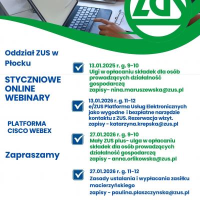 -13.01.2026 r. - godz. 09.00-10.00 - Ulgi w opłacaniu składek dla osób prowadzących działalność gospodarczą. Zapisy- nina.maruszewska@zus.pl;
