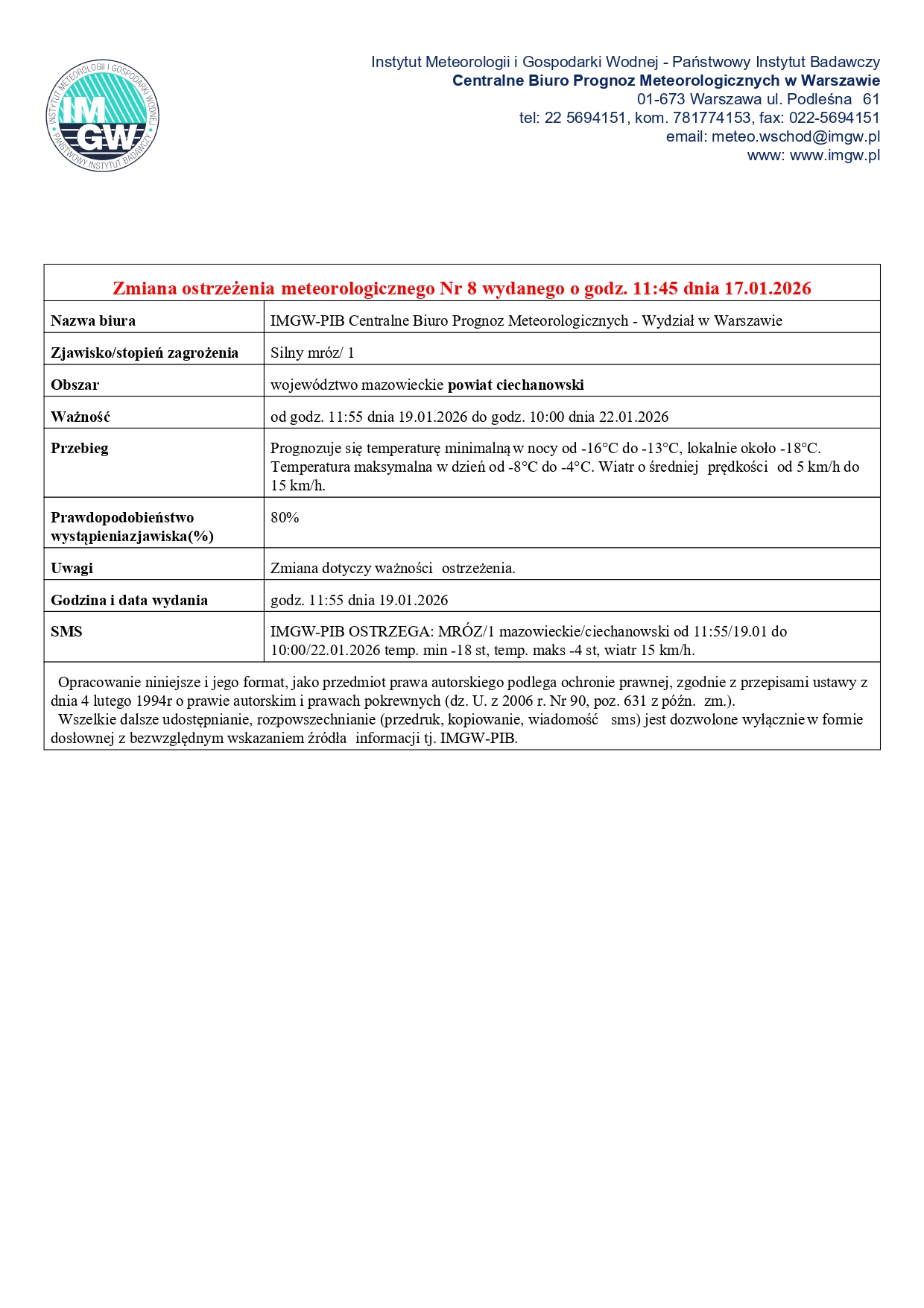 Prognozuje się temperaturę minimalną w nocy od -16°C do -13°C, lokalnie około -18°C. Temperatura maksymalna w dzień od -8°C do -4°C. Wiatr o średniej prędkości od 5 km/h do 15 km/h.