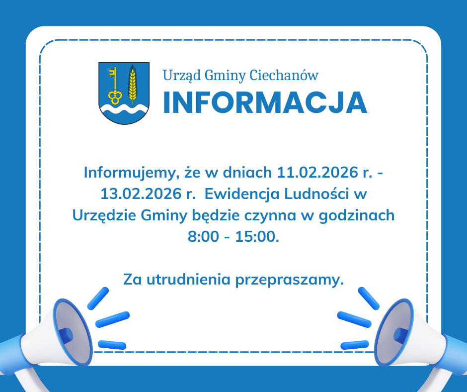Informujemy, że w dniach 11.02.2026 r. - 13.02.2026 r. Ewidencja Ludności w Urzędzie Gminy będzie czynna w godzinach 8:00 - 15:00.