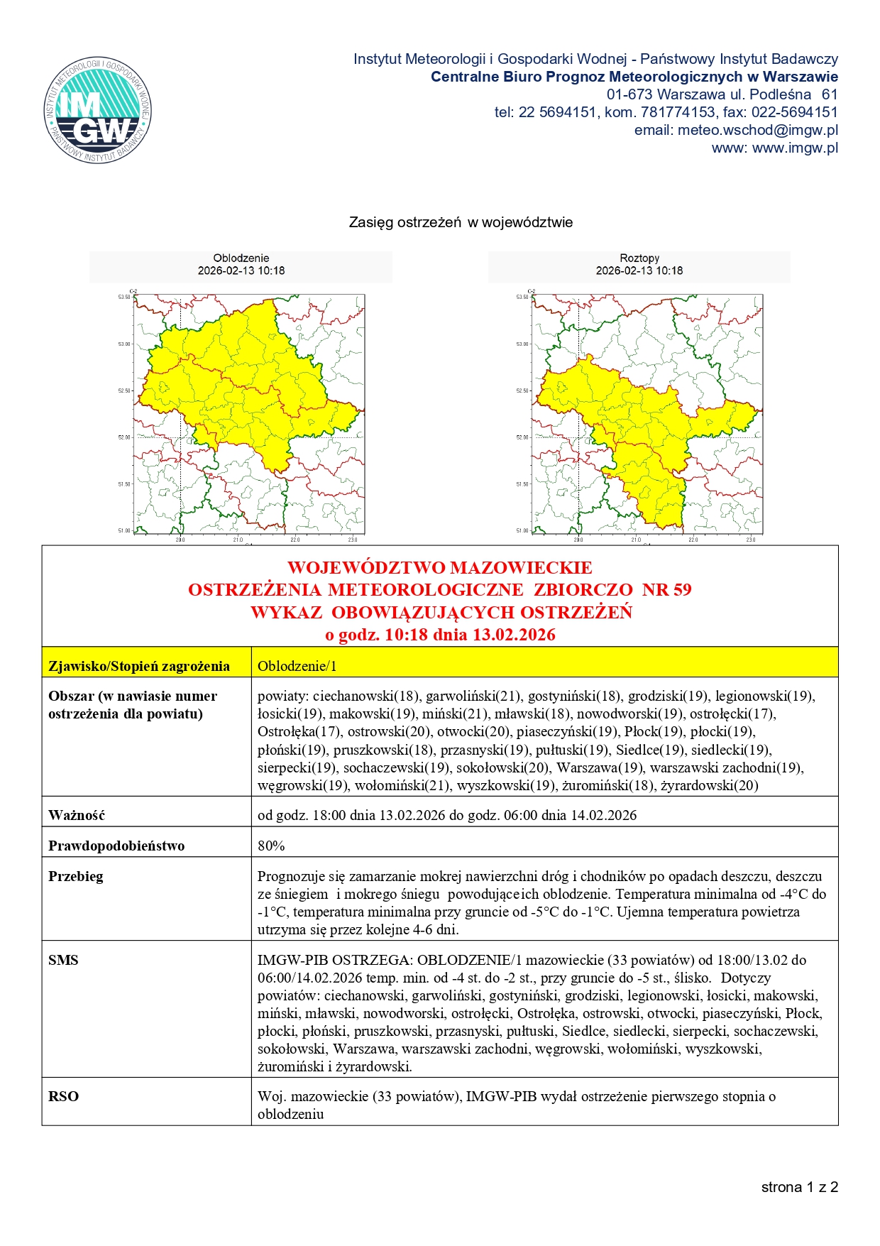 Prognozuje się zamarzanie mokrej nawierzchni dróg i chodników po opadach deszczu, deszczu ze śniegiem i mokrego śniegu powodujące ich oblodzenie.