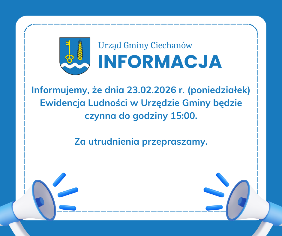 Informujemy, że dnia 23.02.2026 r. (poniedziałek) Ewidencja Ludności w Urzędzie Gminy będzie czynna do godziny 15:00.