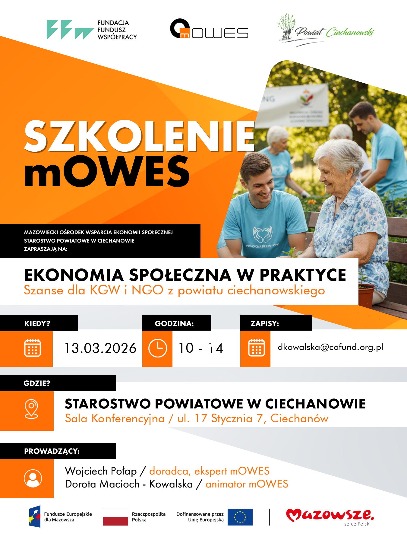 Mazowiecki Ośrodek Wsparcia Ekonomii Społecznej oraz Starostwo Powiatowe w Ciechanowie zapraszają na szkolenie "Ekonomia społeczna w praktyce".