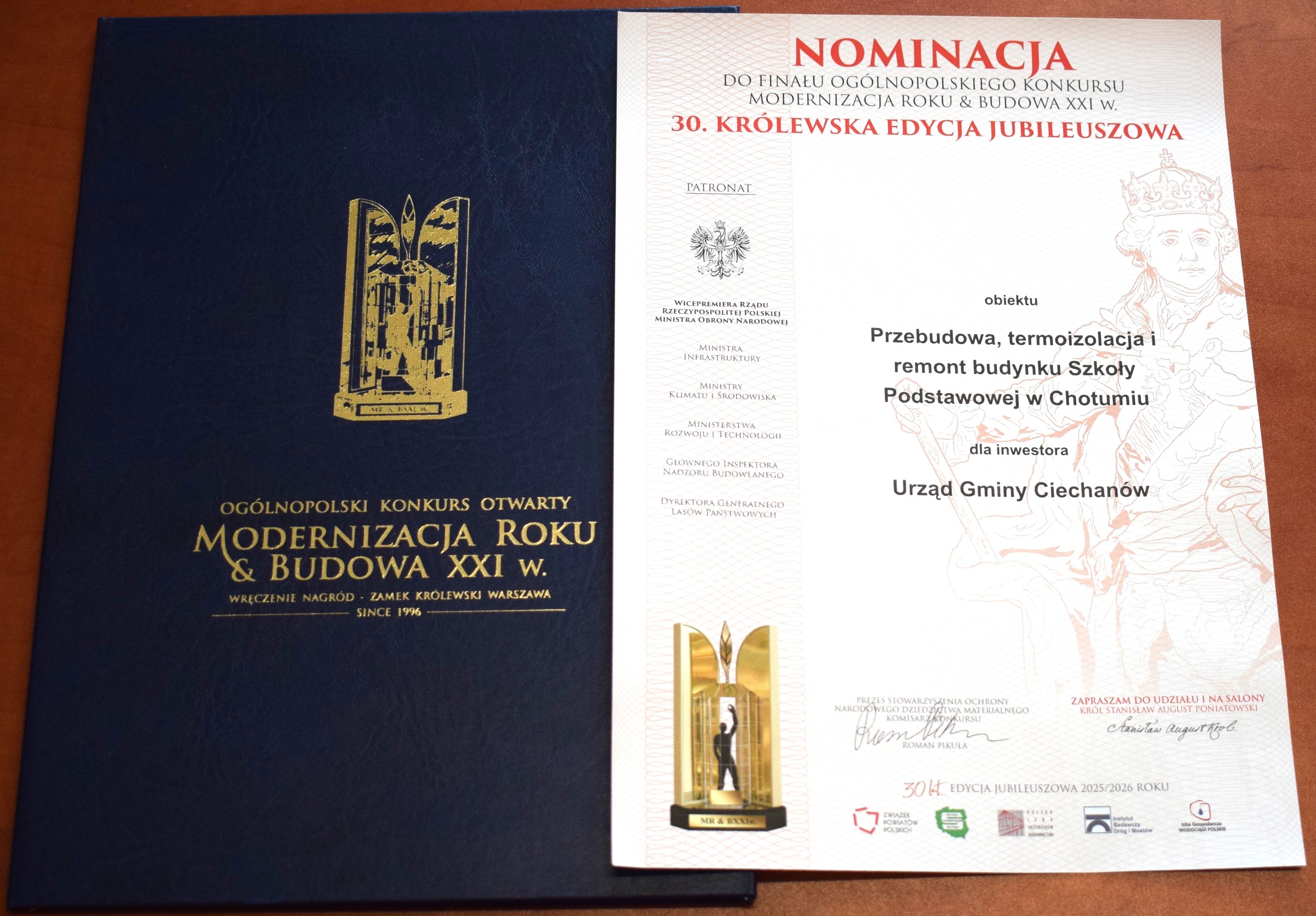 Miło nam poinformować, że Gmina Ciechanów została nominowana do finału Ogólnopolskiego Konkursu „Modernizacja Roku & Budowa Roku XXI wieku”. Do finału zakwalifikowana została inwestycja pn. „Przebudowa, termoizolacja i remont budynku Szkoły Podstawowej w Chotumiu” zrealizowana przez Gminę Ciechanów.