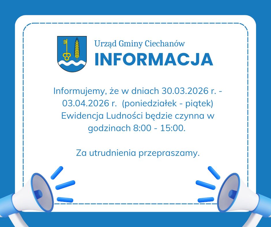 Informujemy, że w dniach 30.03.2026 r. - 03.04.2026 r. (poniedziałek - piątek) Ewidencja Ludności będzie czynna w godzinach 8:00 - 15:00.