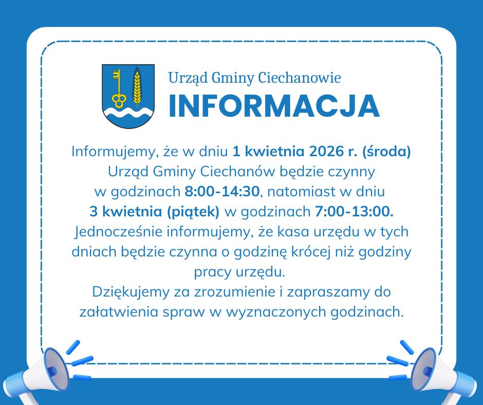 Informujemy, że w dniu 1 kwietnia 2026 r. (środa) Urząd Gminy Ciechanów będzie czynny w godzinach 8:00-14:30, natomiast w dniu 3 kwietnia (piątek) w godzinach 7:00-13:00.