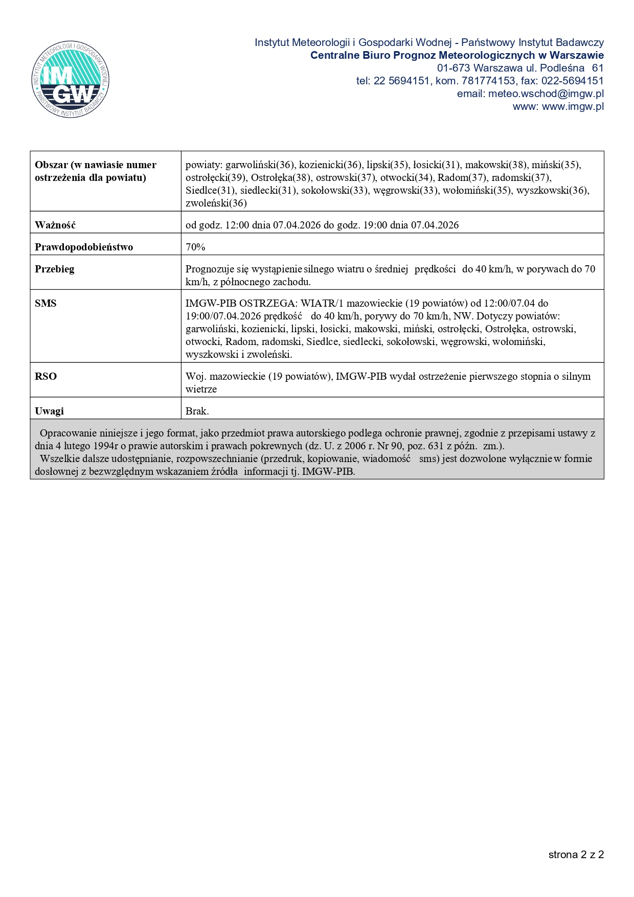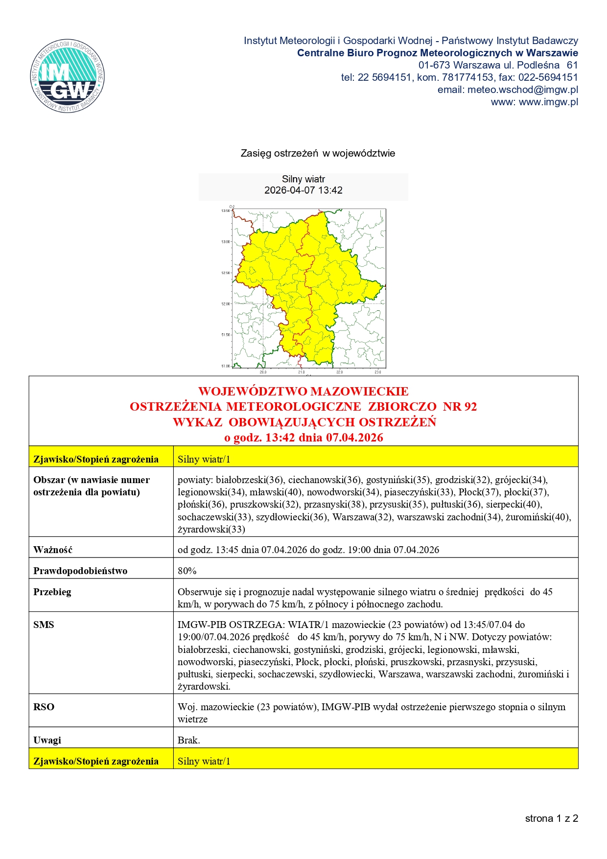 Obserwuje się i prognozuje nadal występowanie silnego wiatru o średniej prędkości do 45 km/h, w porywach do 75 km/h, z północy i północnego zachodu.