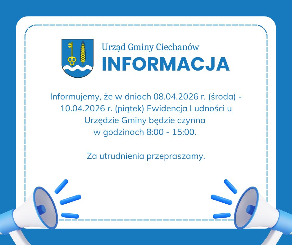 Informujemy, że w dniach 08.04.2026 r. (środa) - 10.04.2026 r. (piątek) Ewidencja Ludności u Urzędzie Gminy będzie czynna w godzinach 8:00 - 15:00.