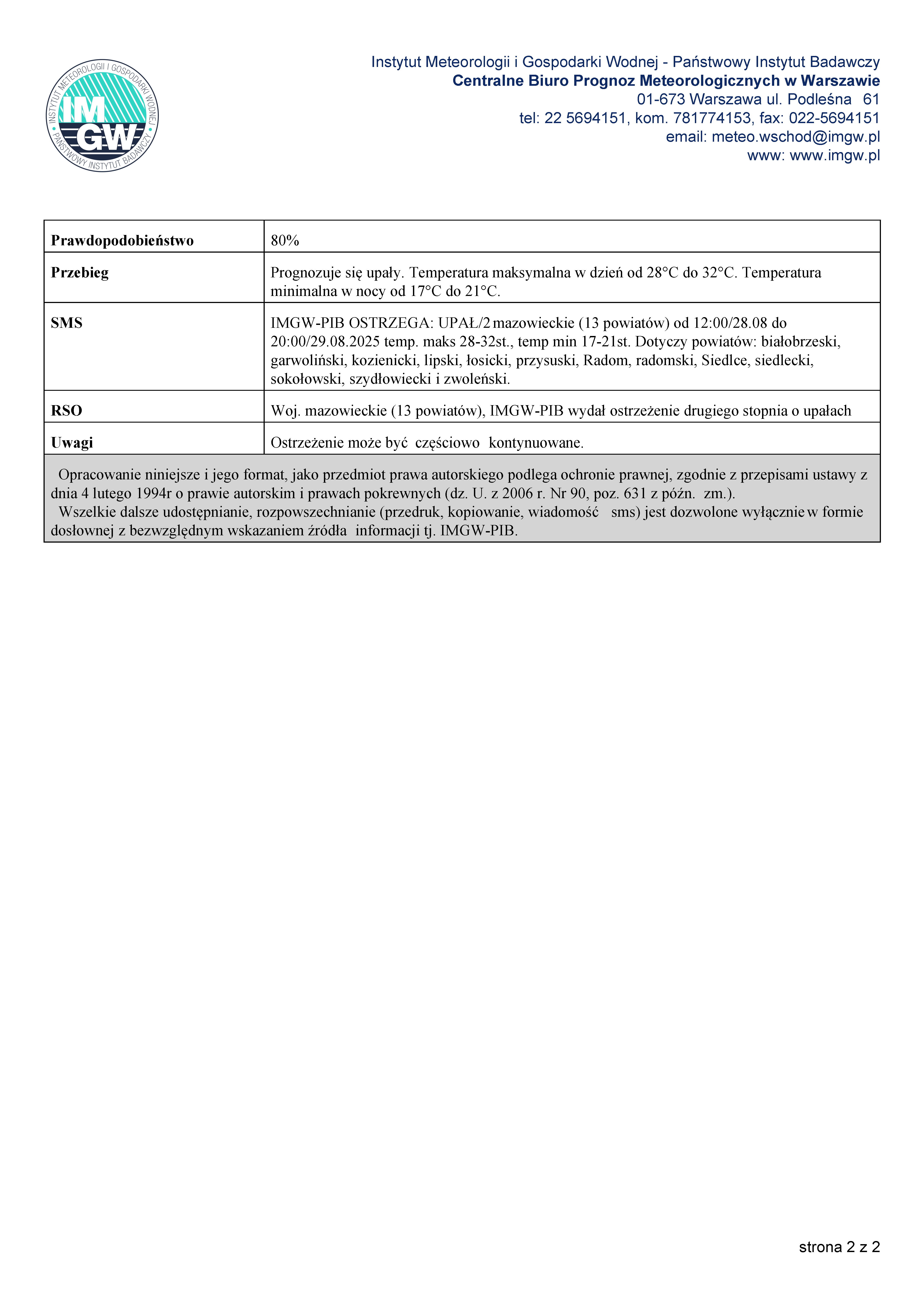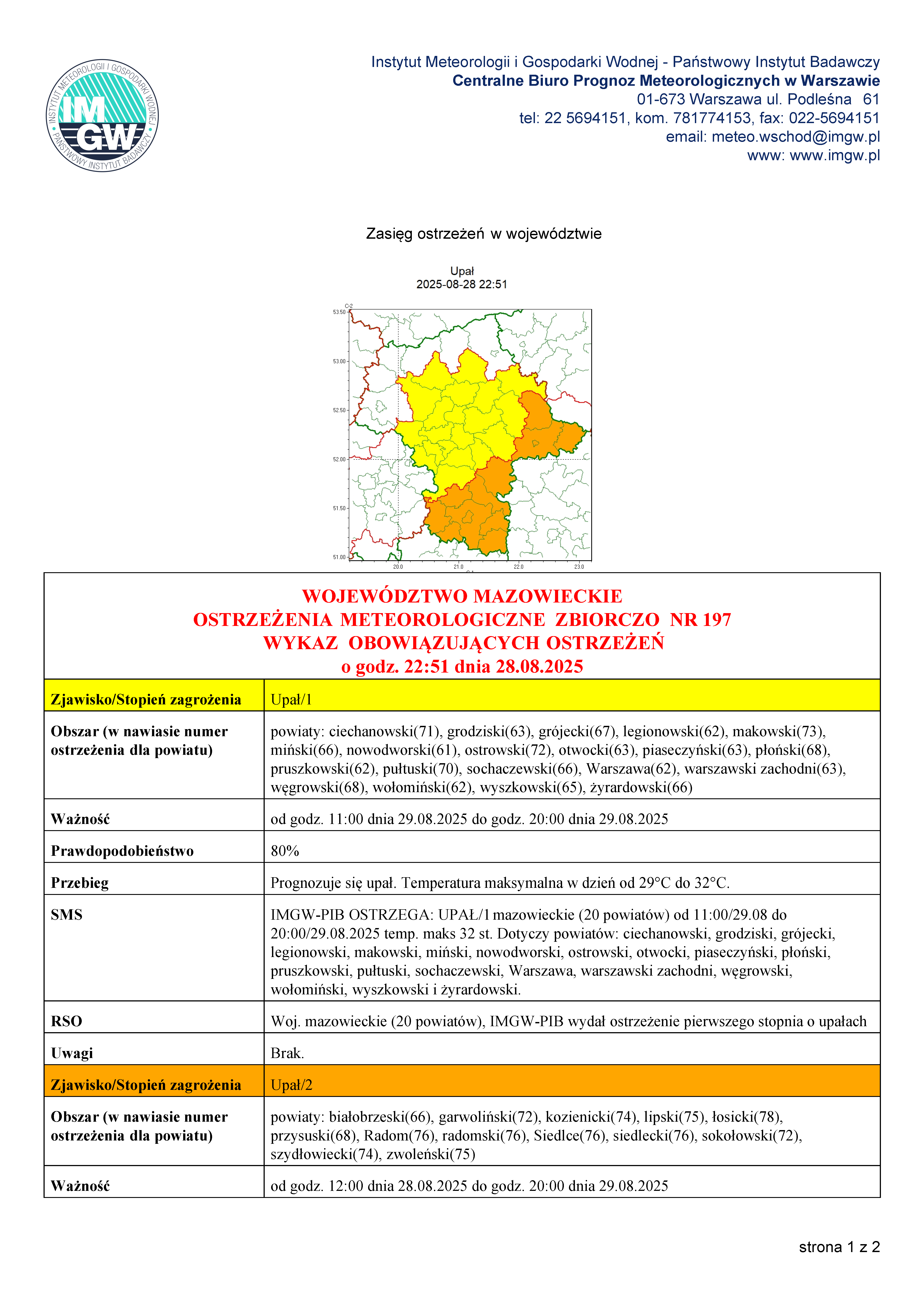 WOJEWÓDZTWO MAZOWIECKIE OSTRZEŻENIA METEOROLOGICZNE ZBIORCZO NR 197 WYKAZ OBOWIĄZUJĄCYCH OSTRZEŻEŃ o godz. 22:51 dnia 28.08.2025