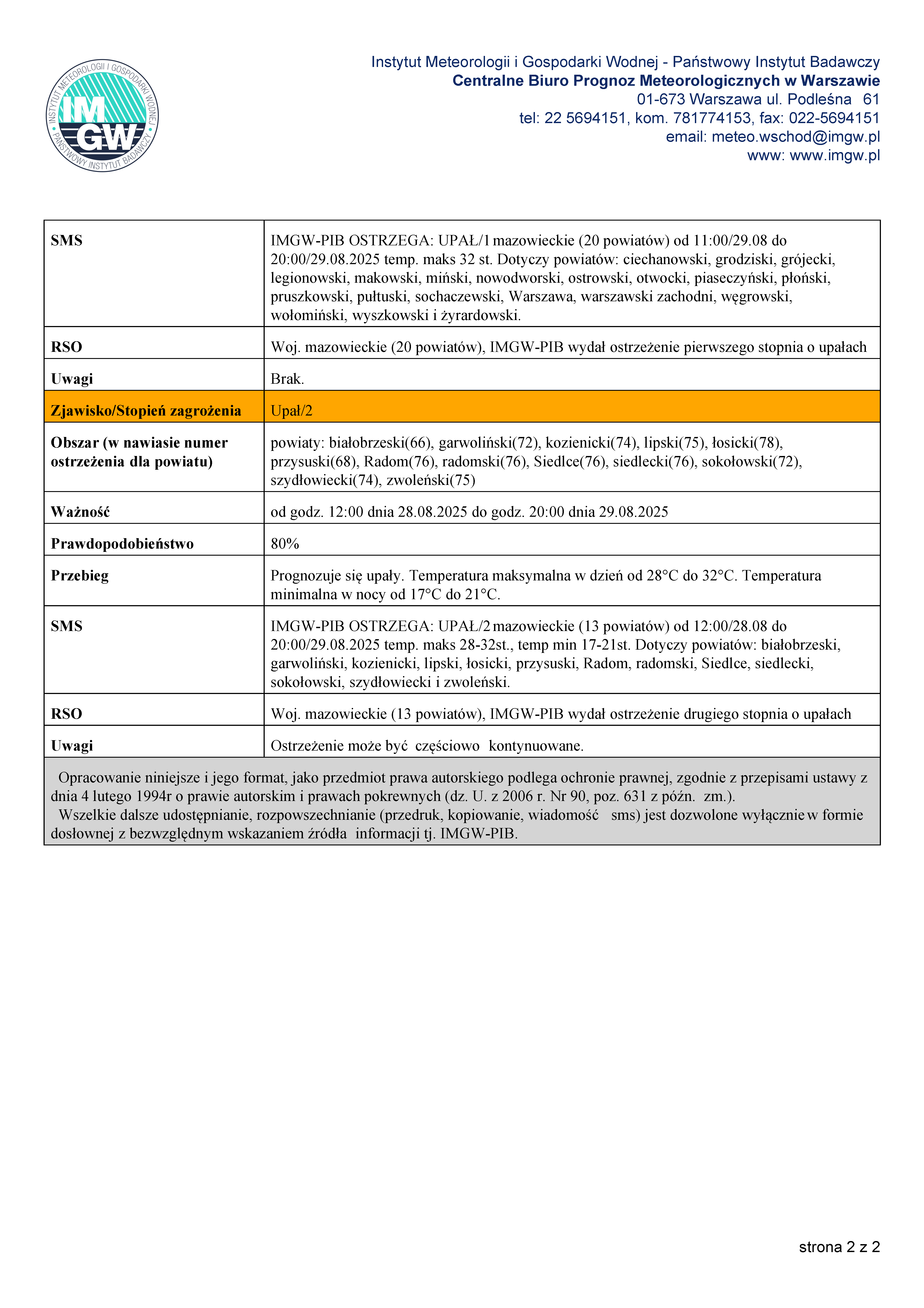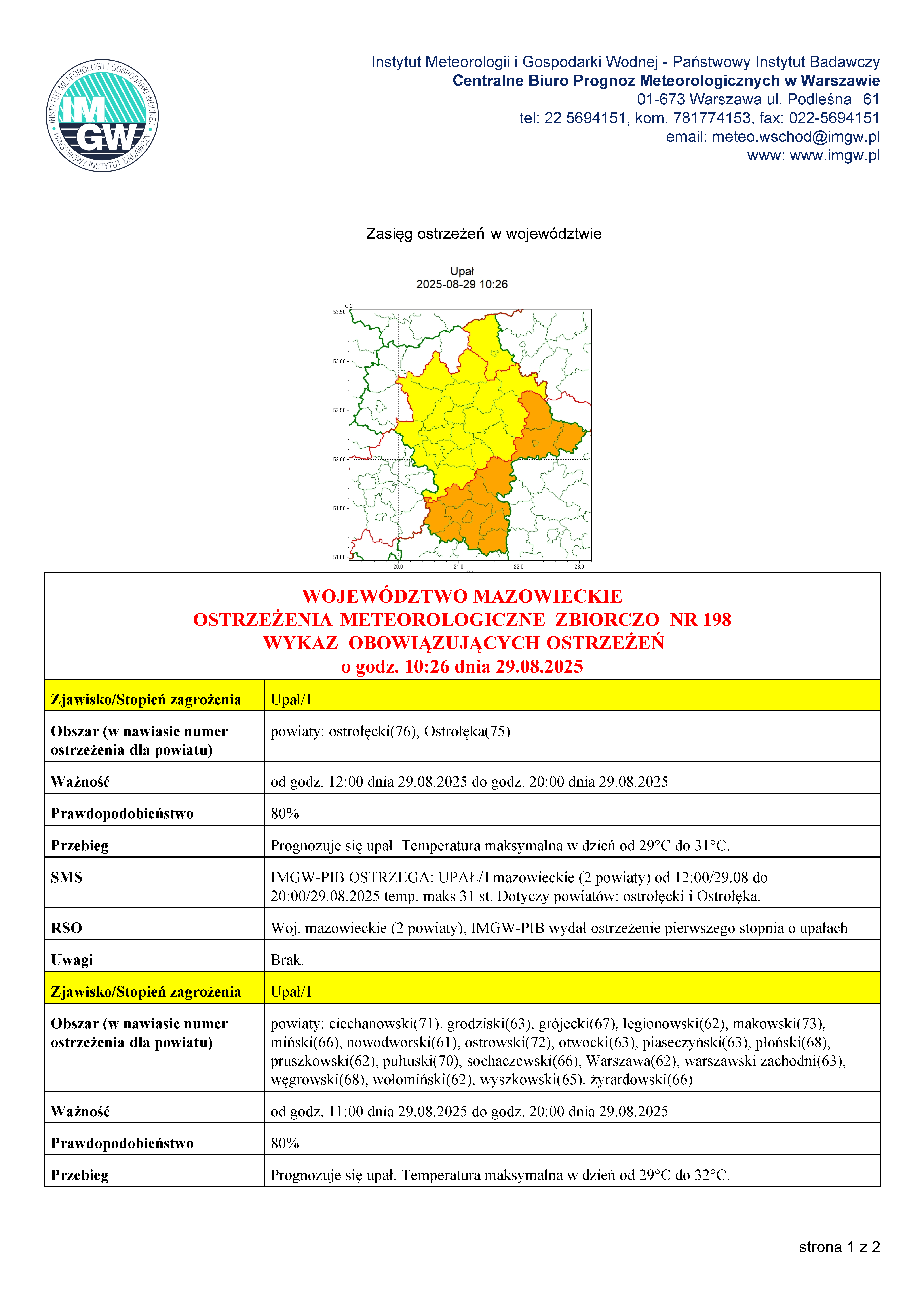 WOJEWÓDZTWO MAZOWIECKIE OSTRZEŻENIA METEOROLOGICZNE ZBIORCZO NR 198 WYKAZ OBOWIĄZUJĄCYCH OSTRZEŻEŃ o godz. 10:26 dnia 29.08.2025