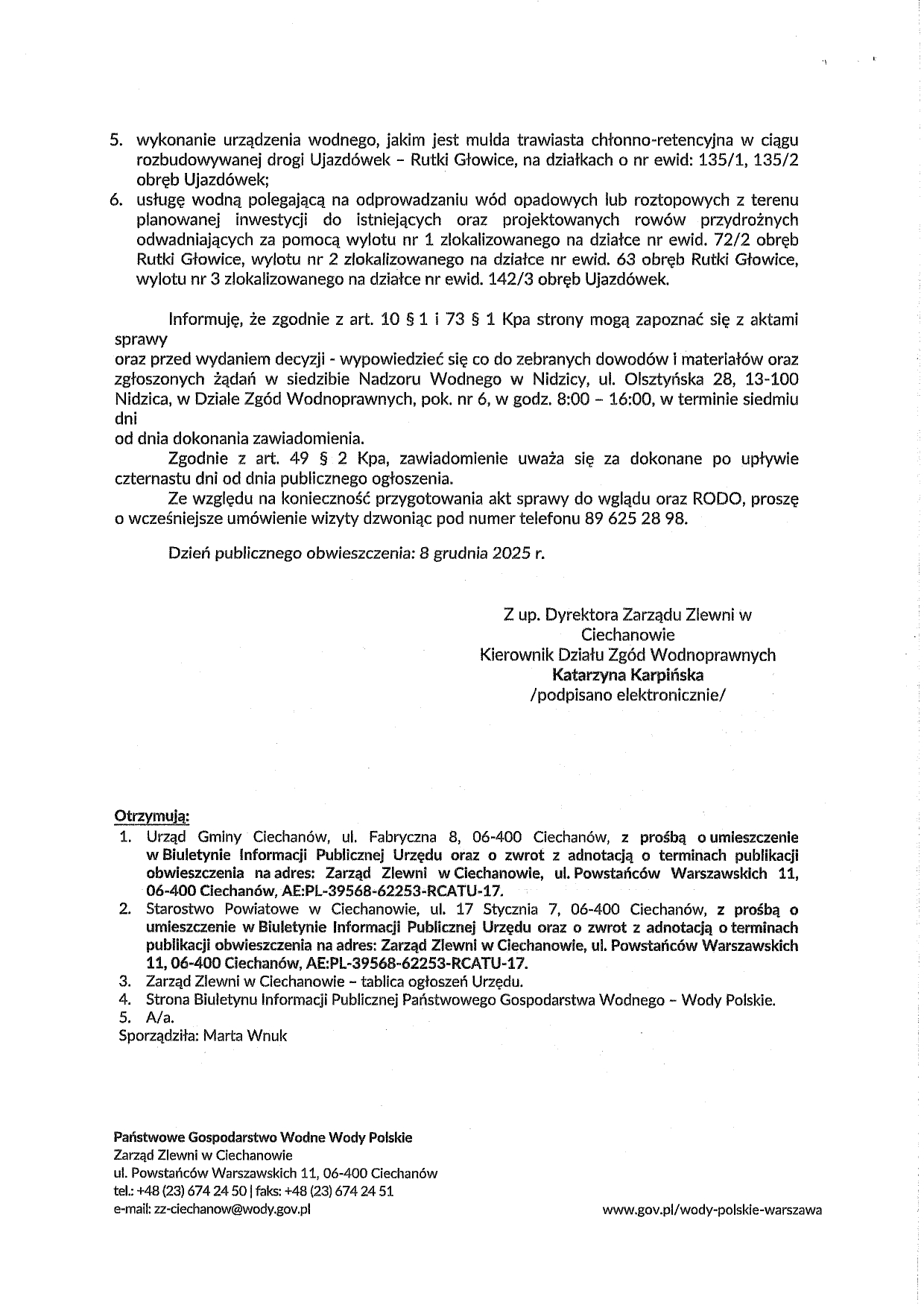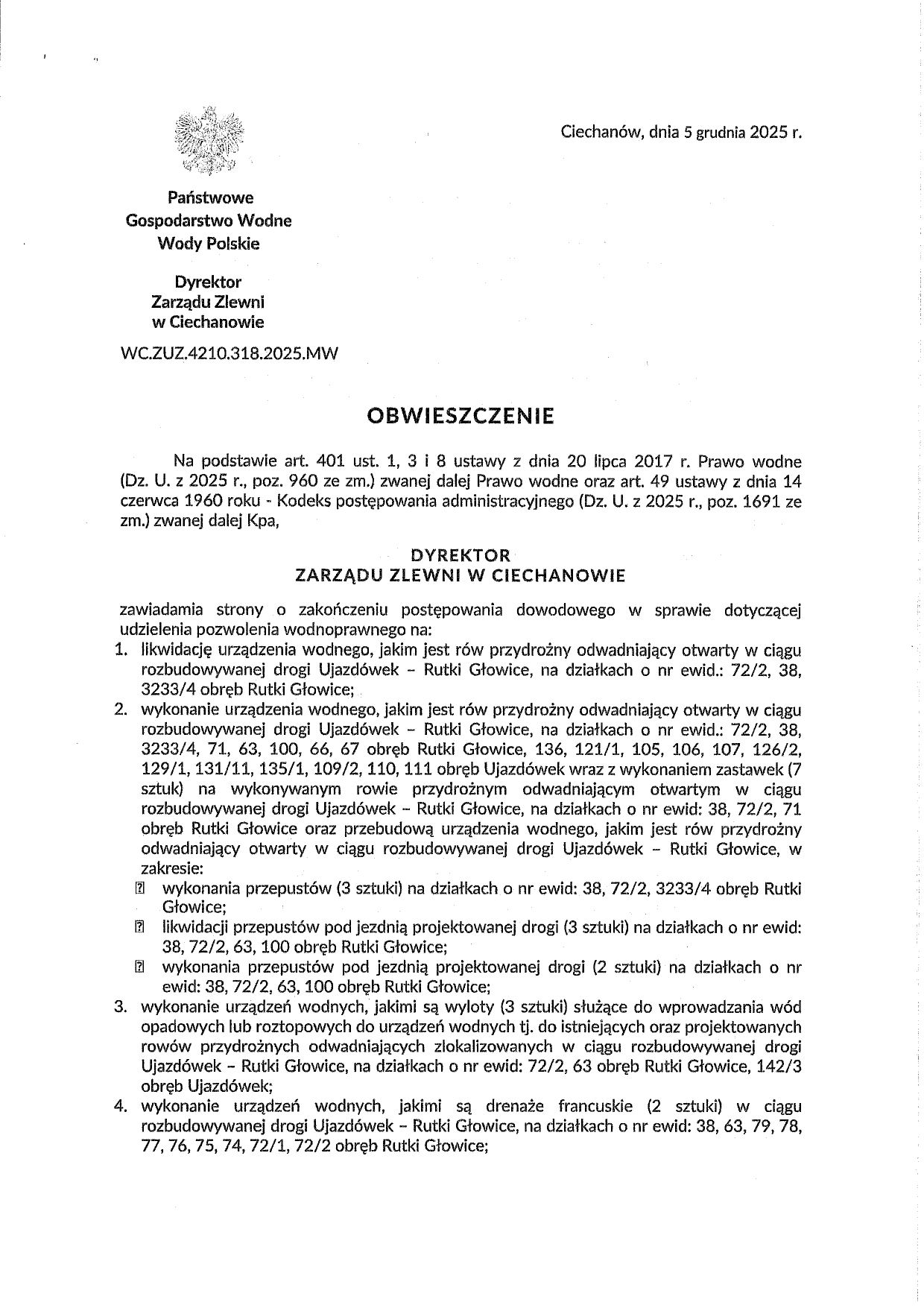 OBWIESZCZENIE DYREKTORA ZARZĄDU ZLEWNI W CIECHANOWIE Z DNIA 5 GRUDNIA 2025R.