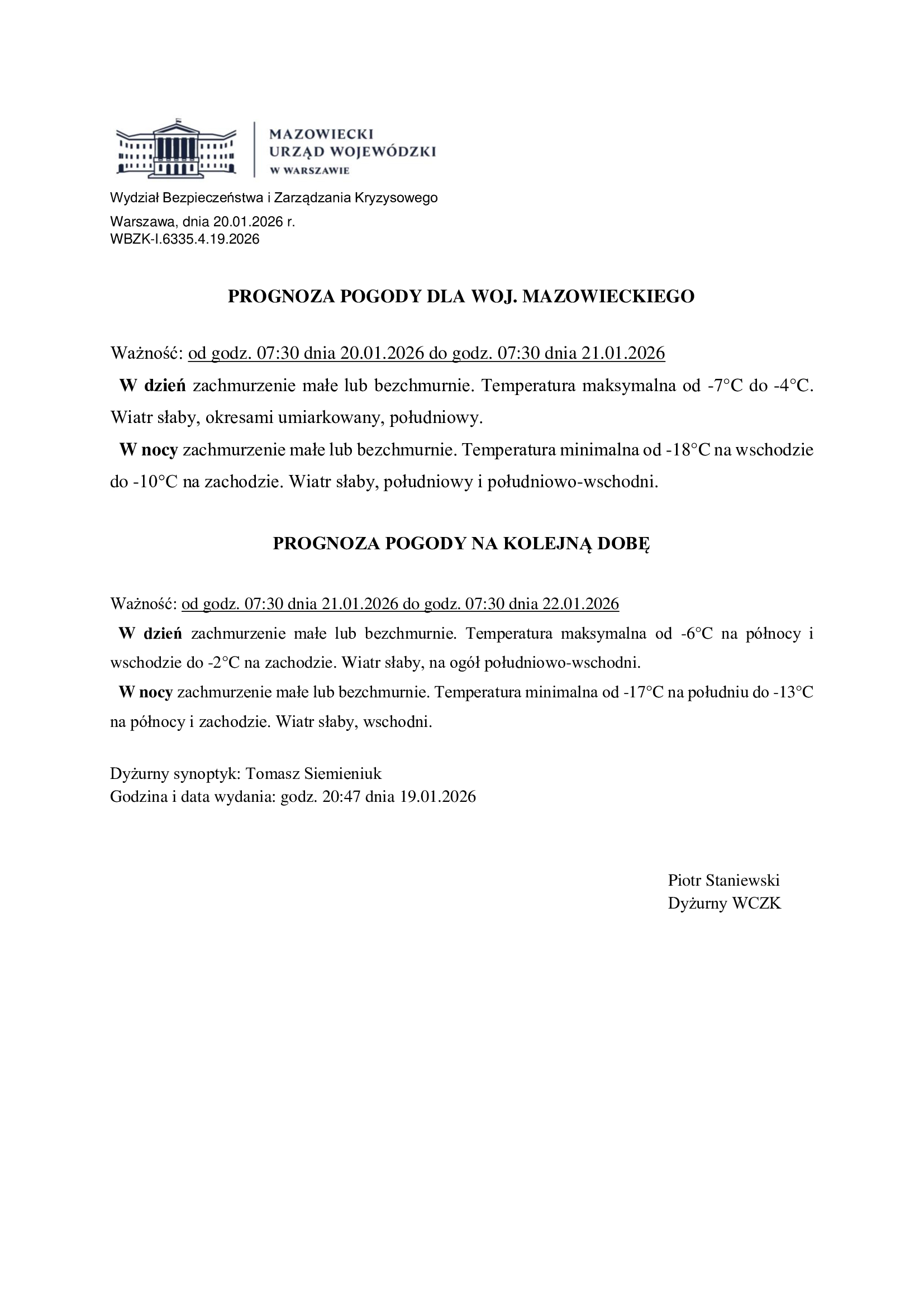 Ważność: od godz. 07:30 dnia 20.01.2026 do godz. 07:30 dnia 21.01.2026
