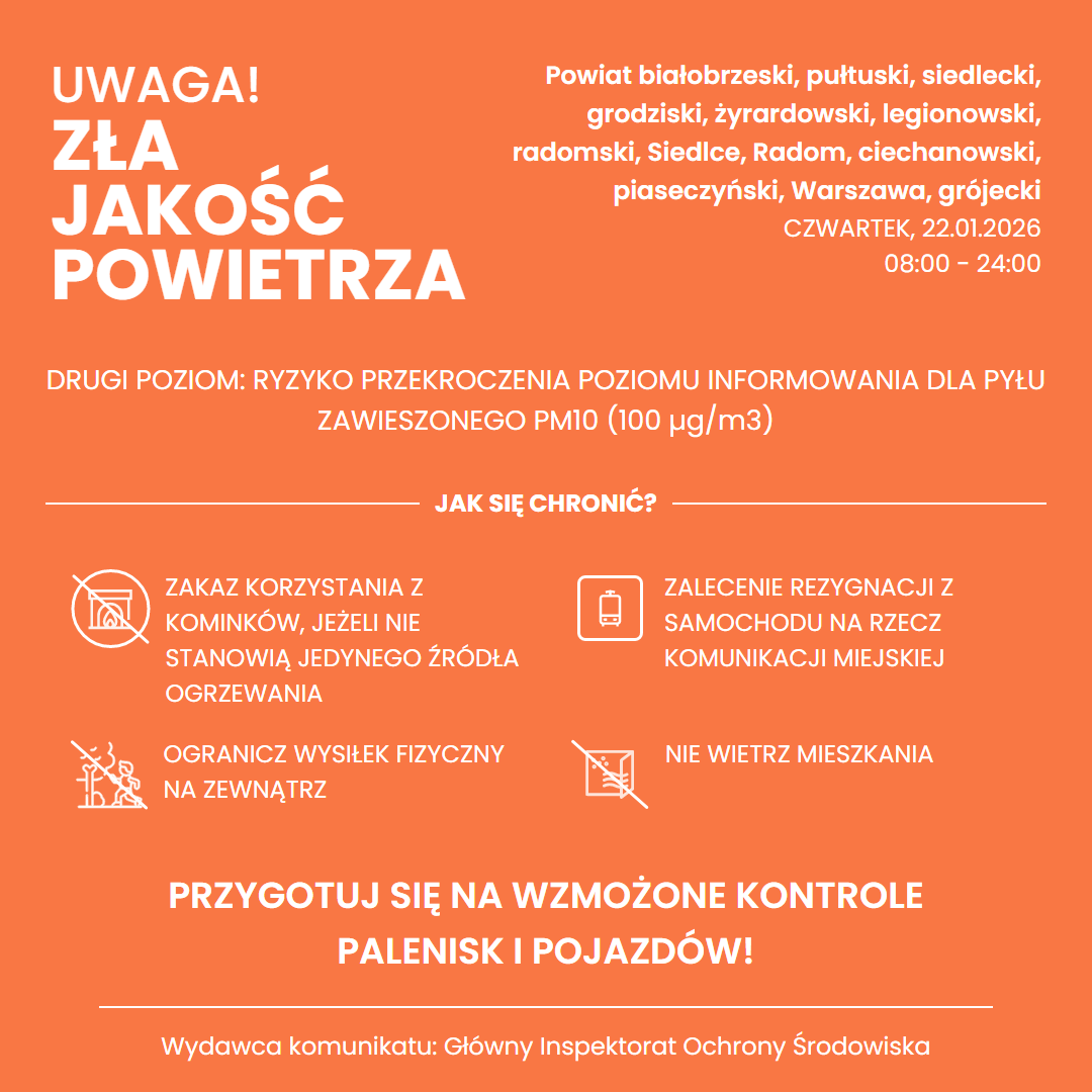 Zagrożenie: Ryzyko wystąpienia przekroczenia średniodobowego poziomuinformowania - 100 μg/m3 dla pyłu zawieszonego PM10 wpowietrzu